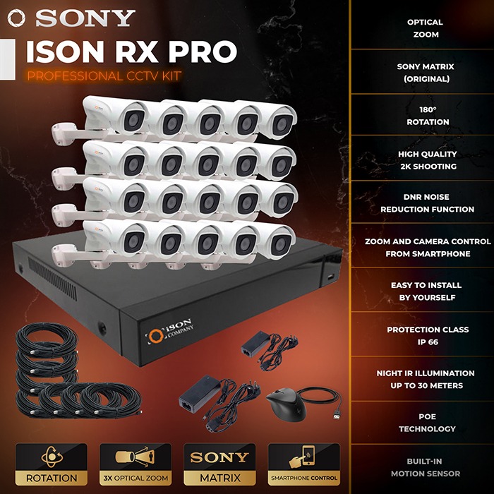 The ISON RX PRO 5 megapixel video surveillance system for 20 cameras is a popular solution among professionals. All cameras of the video surveillance system ISON RX PRO have a function of remote rotation of 180 ° horizontally, 45 ° vertically, 3x optical zoom. The system has a high resolution of 5 megapixel 2K and motorized lens, which allows you to control the zoom cameras remotely from a smartphone, tablet or computer located anywhere in the world. High definition will provide a professional level of protection at sites such as private homes and cottages, business facilities, warehouses, garages, garages, production facilities, etc. Ready-made video surveillance system for 5 megapixel ISON RX PRO for 20 cameras includes everything you need for a complete video surveillance system cameras, cable with ready-made connectors, video recorder, power supply for CCTV cameras, power supply for NVR. For correct operation of rotary functions, power supply for PTZ cameras should be organized by the original power supply unit (included in the kit) at the place of installation of the camera. ISON RX PRO system for 20 cameras is easy to install yourself thanks to our step-by-step instructions.