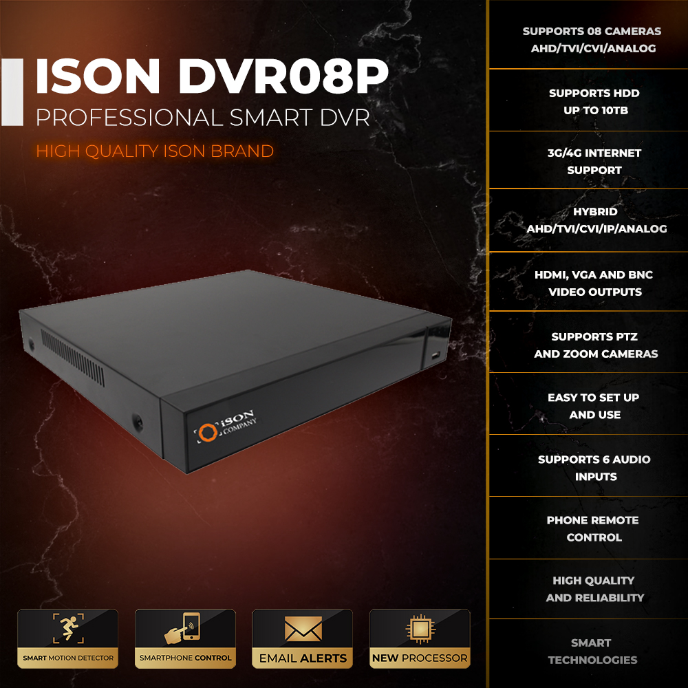 • 8-channel video recorder (16 IP channels, 8 AHD channels) with support for all ISON cameras;