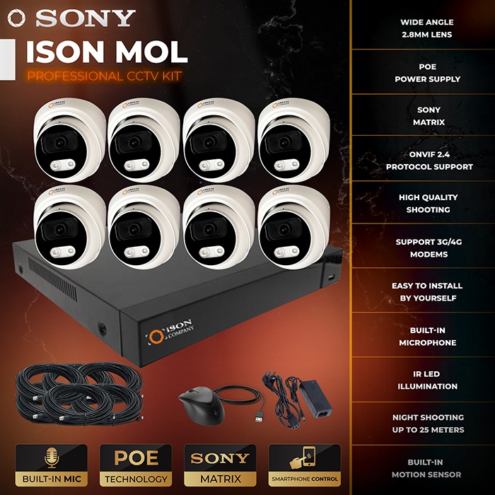 Prepared IP video surveillance system with audio recording ISON MOL-S for 8 cameras with power transmission over a single cable POE is a professional solution for home, cottage store and other objects where you need high quality audio and video recording. The system records in high-definition 2K format. IP Video Surveillance System ISON MOL-S for 8 cameras for 3 megapixels includes everything you need for a complete video surveillance system: IP cameras 3 megapixels with motion sensors, night illumination, high resolution 2K with built-in microphones with noise reduction, DVR, cable, connectors, switch, batteries. Ready-made IP video surveillance kit with audio recording ISON MOL-S 3 megapixel easy to install yourself. Video surveillance system has all the latest features and capabilities from motion sensors to remote viewing from a smartphone and support for 3g / 4G.