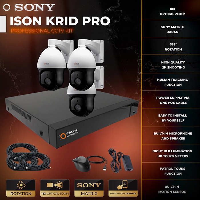 The ISON KRID PRO 5 megapixel video surveillance system for 3 cameras is a popular solution among professionals. All cameras of the video surveillance system ISON KRID PRO have a function of remote rotation at 355 ° horizontally, 70 ° vertically, 18-fold zoom. The system has a high resolution of 5 megapixels 2K and motorized lens, which allows you to control the zoom cameras remotely from a smartphone, tablet or computer located anywhere in the world. High definition will provide a professional level of protection at sites such as private homes and cottages, business facilities, warehouses, garages, production facilities, etc. Ready-made video surveillance system for 5 megapixels ISON KRID PRO for 3 cameras includes everything you need for a complete video surveillance system cameras, cable with ready-made connectors, video recorder, power supply for CCTV cameras, power supply.