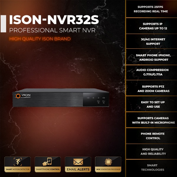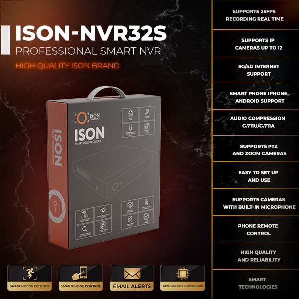 Professional 32 channel IP recorder NVR. Compatible with all ISON cameras. Supports remote viewing option from smartphone as well as remote viewing option of recording archive from smartphone or computer. Supports all types of Internet, cameras with built-in microphone, with electronic optical zoom, PTZ control. Latest generation processor. High quality ISON brand! Official warranty 3 years.
