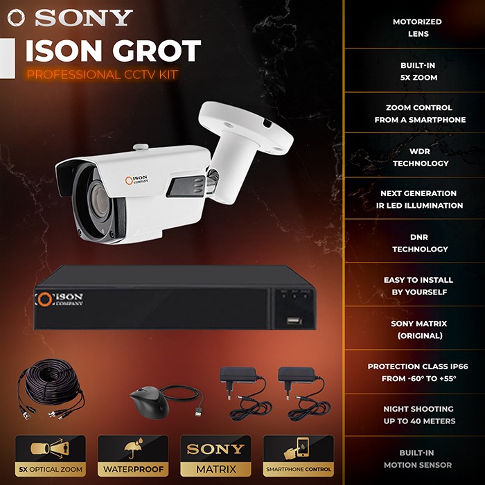 The ISON GROT 5 megapixel 1-camera video surveillance system is a popular solution among professionals. The system has a high resolution of 5 megapixels 2K and a motorized lens that allows you to control the zoom of the cameras remotely from a smartphone, tablet or computer anywhere in the world. High definition will provide a professional level of protection at sites such as private homes and cottages, business facilities, warehouses, garages, production facilities, etc. Ready-made video surveillance system for 5 megapixels ISON GROT for 1 camera includes everything you need for a complete video surveillance system cameras, cable with ready-made connectors, video recorder, power supply for CCTV cameras, power supply for DVR. You can also order this system with a hard disk installed. ISON GROT 1-camera system is easy to install by yourself thanks to our step-by-step instructions.