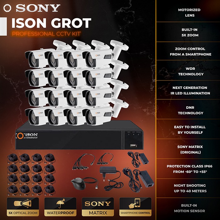 The ISON GROT 5 megapixel video surveillance system for 16 cameras is a popular solution among professionals. The system has a high resolution of 5 megapixels 2K and a motorized lens that allows you to control the zoom of the cameras remotely from a smartphone, tablet or computer anywhere in the world. High definition will provide a professional level of protection at sites such as private homes and cottages, business facilities, warehouses, garages, production facilities, etc. Ready-made video surveillance system for 5 megapixels ISON GROT for 16 cameras includes everything you need for a complete video surveillance system cameras, cable with ready-made connectors, video recorder, power supply for CCTV cameras, power supply for DVR. You can also order this system with a hard disk installed. ISON GROT system for 16 cameras is easy to install by yourself thanks to our step-by-step instructions.