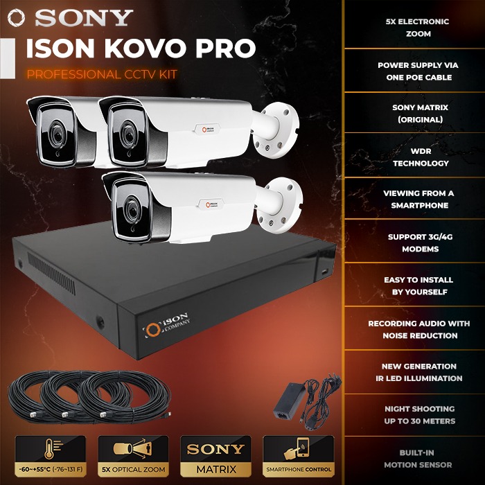 Ready-made IP video surveillance system for 3 cameras POE 4mpx ISON KOVO-3 is one of the most powerful of existing professional video surveillance systems. The system has a high resolution of 4 megapixels with variofocal motorized lenses 2.7-13.5mm (the ability to control the zoom from a smartphone, tablet or computer being anywhere in the world). IP video surveillance system for 3 cameras POE 4mpx ISON KOVO-3 is available in sets of 1,2,4,6,8,16,32 and 64 cameras. You can order IP video surveillance system for 3 cameras in our online store as with a hard disk or without. Video surveillance kit 3 cameras includes everything you need: cable, connectors, variofocal motorized cameras with motion sensors, night illumination high resolution 4 megapixels, recorder, power supply for NVR, power splitter and fasteners.