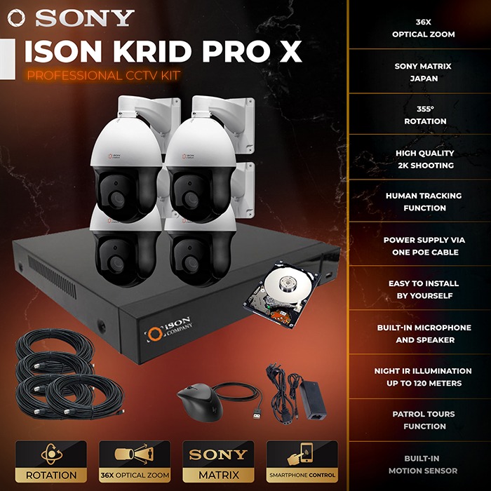 The ISON KRID PRO-X 5 megapixel video surveillance system for 4 cameras is a popular solution among professionals. All cameras of the video surveillance system ISON KRID PRO-X have a function of remote rotation at 355 ° horizontally, 70 ° vertically, 36-fold zoom. The system has a high resolution of 5 megapixel 2K and motorized lens, which allows you to control the zoom cameras remotely from a smartphone, tablet or computer located anywhere in the world. High definition will provide a professional level of protection at sites such as private homes and cottages, business facilities, warehouses, garages, garages, production facilities, etc. Ready-made video surveillance system for 5 megapixel ISON KRID PRO-X for 4 cameras includes everything you need for a complete video surveillance system cameras, cable with ready-made connectors, video recorder, power supply.
