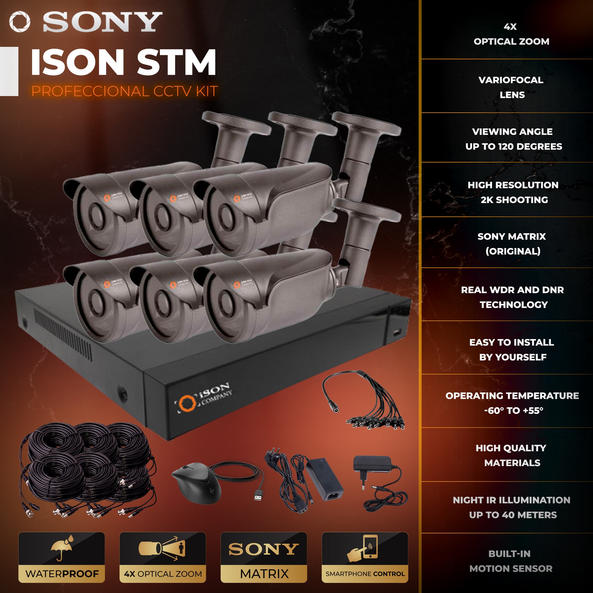 - 6 all-weather full HD 1080p variofocal cameras ISON AHD50S-CU 2MP;