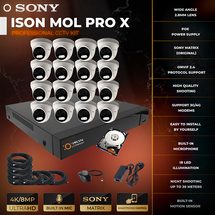 Prepared IP video surveillance system with audio recording ISON MOL PRO X with power transmission over a single cable POE is a professional solution for home, cottage store and other objects where you need high quality audio and video recording. The system records in high-definition 4K format. IP Video Surveillance System ISON MOL PRO X for 8 megapixels with sound recording includes everything you need for a complete video surveillance system: IP cameras 8 megapixels with motion sensors, night illumination, high resolution 4K with built-in microphones with noise reduction, video recorder, cable, connectors, switch, batteries. Ready-made IP video surveillance kit with audio recording ISON MOL PRO X 8 megapixels is easy to install yourself. The video surveillance system has all the latest features and capabilities from motion sensors to remote viewing from a smartphone and support for 3g/4g.
