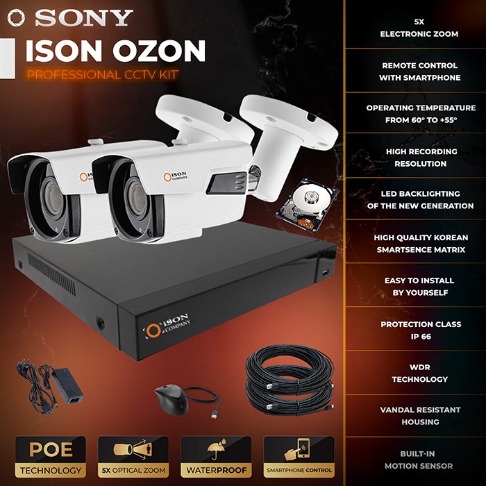 Ready-made IP video surveillance system for 2 cameras POE 5 megapixels ISON OZON 2 is one of the most powerful of existing professional video surveillance systems. The system has a high resolution of 5 megapixels with variofocal motorized lenses 2.7-13.5mm (the ability to control the zoom from a smartphone, tablet or computer being anywhere in the world). IP video surveillance system for 2 cameras POE 5 megapixels ISON OZON 2 is available in sets of 1,2,4,6,8,16,32 and 64 cameras. You can order IP video surveillance system for 2 cameras in our online store as with a hard disk or without. Video surveillance kit 2 cameras includes everything you need: cable, connectors, varifocal motorized cameras with motion sensors, night illumination high resolution 5 megapixels, recorder, power supply for NVR, power splitter and fasteners.