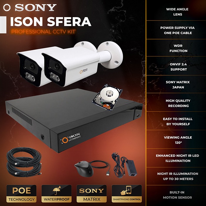 Ready-made IP video surveillance system with POE power supply. Video surveillance kit ISON SFERA for 2 cameras record in high definition 3 megapixel 2k, and also has a convenient function of power and video signal transmission over a single cable POE, this function will greatly simplify the installation and configuration of the system. ISON SFERA video surveillance system has a function of remote viewing from a smartphone. The system has a built-in POE switch, support for 3g/4g, built-in motion sensors, high quality matrix Sony. IP video surveillance system with POE ISON SFERA for 2 cameras includes IP cameras with POE power, video surveillance cable twisted pair with connectors, NVR with built-in POE ports. Ready-made IP video surveillance system ISON SFERA for 2 cameras with POE is easy to connect and configure by yourself.