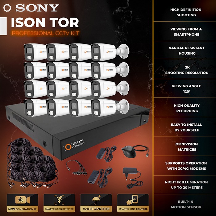The ISON TOR-S 4 megapixel video surveillance system for 16 cameras is a popular solution among professionals. The system has a high resolution of 4 megapixels 2K. High definition will provide a professional level of protection at sites such as private homes and villas, business facilities, warehouses, garages, production facilities, etc. Ready-made video surveillance system for 4 megapixels ISON TOR-S for 16 cameras includes everything you need for a complete video surveillance system cameras, cable with ready-made connecs, video recorder, power supply for CCTV cameras, power supply for DVR. You can also order this system with a hard disk installed. ISON TOR-S system for 16 cameras is easy to install by yourself thanks to our step-by-step instructions.