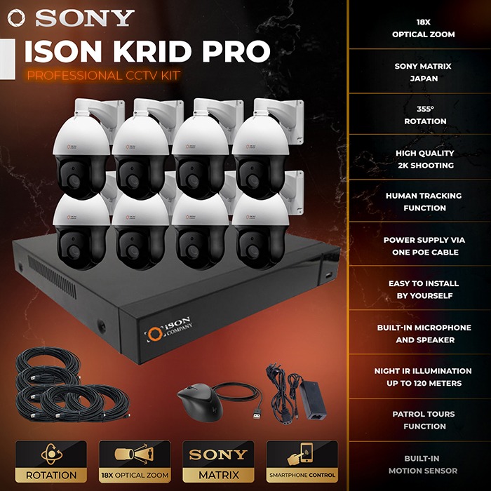 The ISON KRID PRO 5 megapixel video surveillance system for 8 cameras is a popular solution among professionals. All cameras of the video surveillance system ISON KRID PRO have a function of remote rotation at 355 ° horizontally, 70 ° vertically, 18-fold zoom. The system has a high resolution of 5 megapixel 2K and motorized lens, which allows you to control the zoom cameras remotely from a smartphone, tablet or computer located anywhere in the world. High definition will provide a professional level of protection at sites such as private homes and cottages, business facilities, warehouses, garages, garages, production facilities, etc. Ready-made video surveillance system for 5 megapixels ISON KRID PRO for 8 cameras includes everything you need for a complete video surveillance system cameras, cable with ready-made connectors, video recorder, power supply.