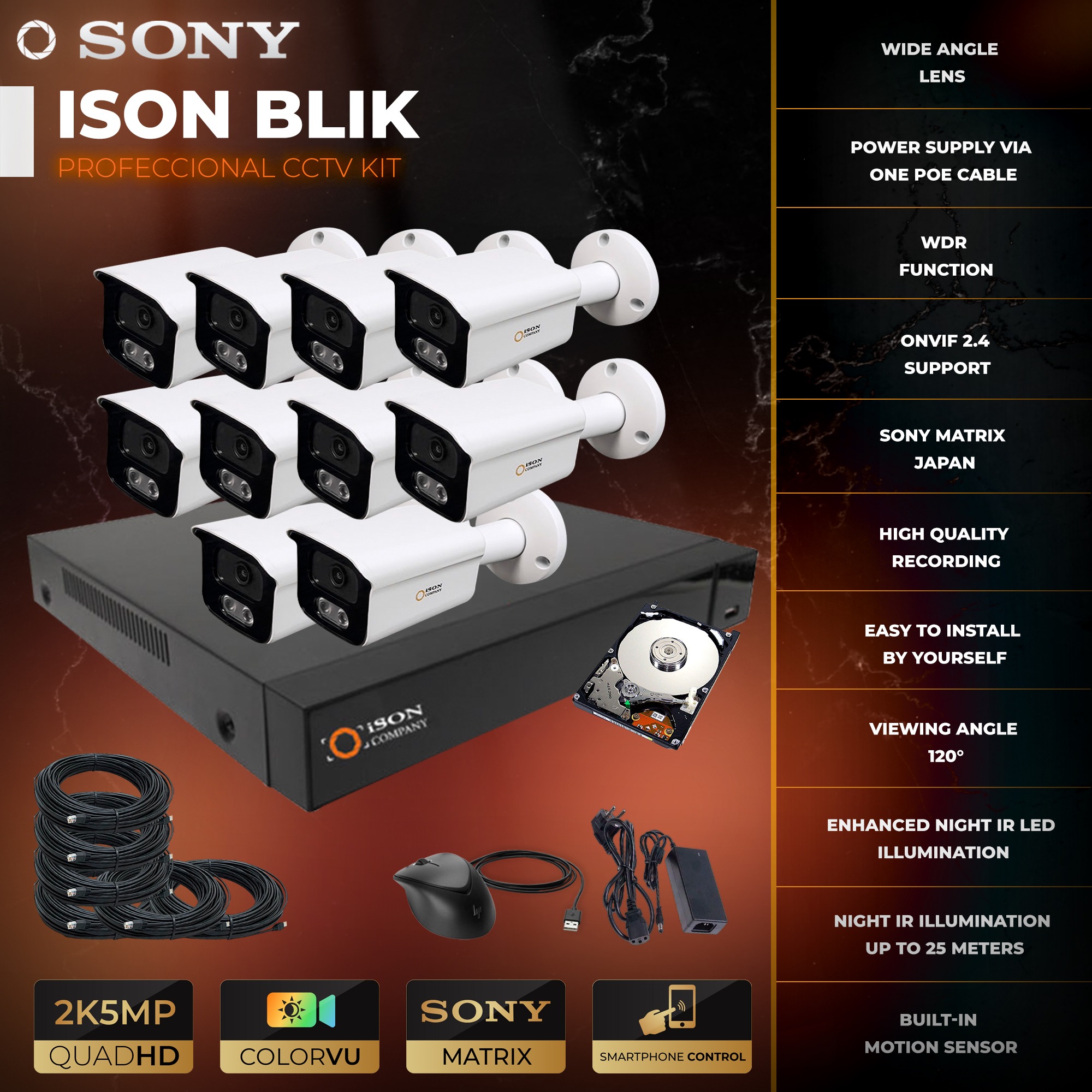 Ready-made IP video surveillance system with POE power supply. Video surveillance kit ISON BLIK for 10 cameras records in high definition 5 megapixels 1440p, and has a convenient function of power and video signal transmission over a single cable POE, this function will greatly simplify the installation and configuration of the system. ISON BLIK video surveillance system has a function of remote viewing from a smartphone. The system has a built-in POE switch, support for 3g/4g, built-in motion sensors, high quality matrix SONY (ORIGINAL). IP video surveillance system with POE ISON BLIK for 10 cameras includes IP cameras with POE power, video surveillance cable twisted pair with connectors, NVR with built-in POE ports. Ready-made IP video surveillance system ISON BLIK for 10 cameras with POE is easy to connect and configure yourself.