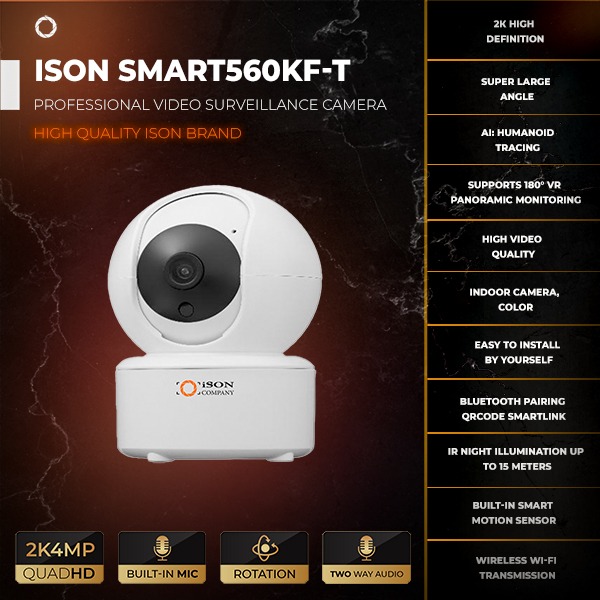 Professional high quality wireless IP Wi-Fi video surveillance camera 4 megapixels with support for motion detection recording, night illumination up to 10 meters. This CCTV camera has a high resolution of 4 megapixels 2K. Included are mounting dowels and screws, power supply. Indoor camera, color. Super large angle, VRmodel supports 180° VR panoramic monitoring andelectronic PTZ function, PTZ: Rotation Angle level: 355°; Vertical: 90°, WIFI 802.11 b/g/n, Bluetooth pairing QRcode Smartlink,Light Mode: Full Color/Infraed Vision/DoubleLightAlert, AI: Humanoid tracing, intrusion alarm, Audio: Bidirectional dual-function voice intercom