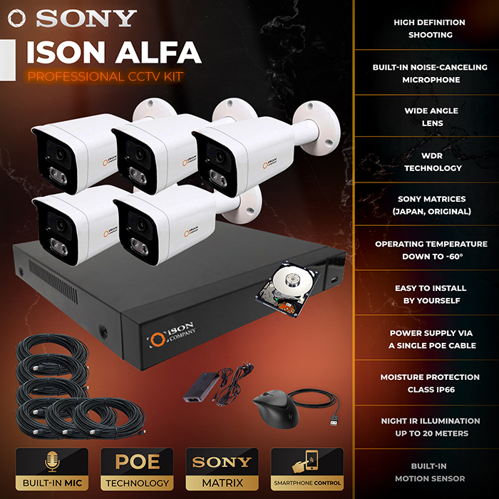 Ready-made IP video surveillance system with POE power supply. Video Surveillance Kit ISON ALFA S for 5 cameras records in high definition 4 megapixel 1440p, and has a convenient function of power and video signal transmission over a single cable POE, this function will greatly simplify the installation and configuration of the system. Video surveillance system ISON ALFA S for 5 cameras has a function of remote viewing from a smartphone. The system has a built-in POE switch, support for 3g / 4G, built-in motion sensors, high-quality matrix SONY (ORIGINAL). IP video surveillance system with POE ISON ALFA S includes IP cameras with POE power, video surveillance cable twisted pair with connectors, DVR with built-in POE ports. Ready-made IP video surveillance system ISON ALFA S for 5 cameras with POE is easy to connect and configure yourself.