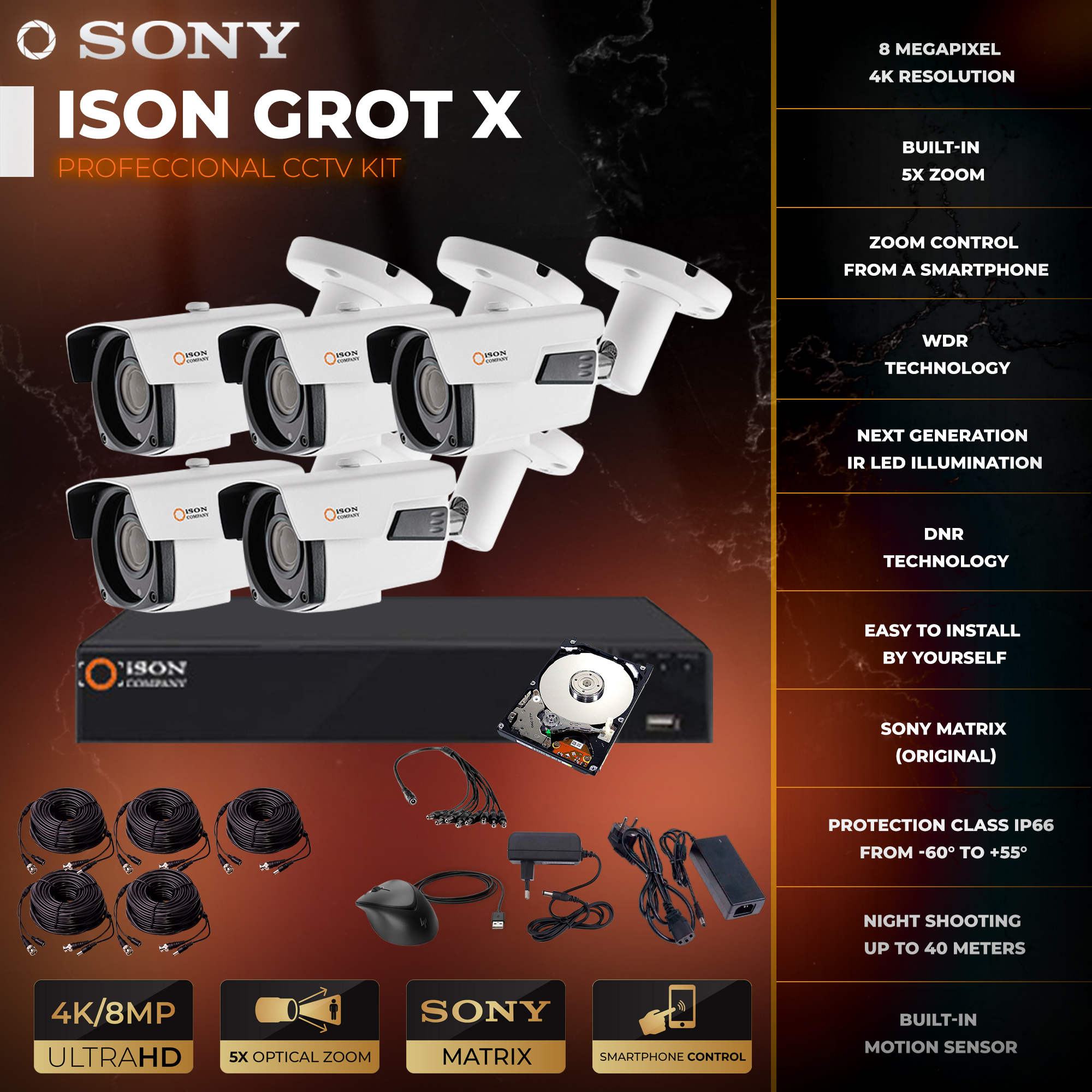 The ISON GROT-X 8 megapixel video surveillance system for 5 cameras is a popular solution among professionals. The system has a high resolution of 8 megapixels 4K and a motorized lens that allows you to control the zoom of the cameras remotely from a smartphone, tablet or computer anywhere in the world. High definition will provide a professional level of protection at sites such as private homes and cottages, business facilities, warehouses, garages, production facilities, etc. Ready-made video surveillance system for 8 megapixels ISON GROT-X for 5 cameras includes everything you need for a complete video surveillance system cameras, cable with ready-made connectors, video recorder, power supply for CCTV cameras, power supply for DVR.