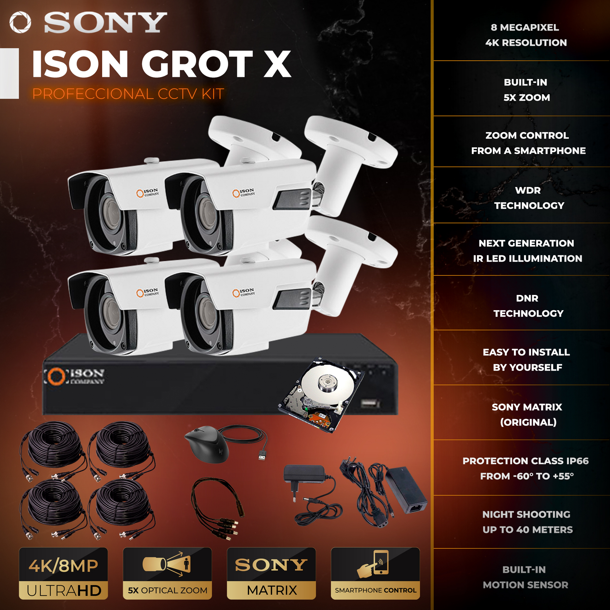 The ISON GROT-X 8 megapixel 4 camera surveillance system is a popular solution among professionals. The system has a high resolution of 8 megapixels 4K and a motorized lens that allows you to control the zoom of the cameras remotely from a smartphone, tablet or computer anywhere in the world. High definition will provide a professional level of protection at sites such as private homes and cottages, business facilities, warehouses, garages, production facilities, etc. Ready-made video surveillance system for 8 megapixels ISON GROT-X for 4 cameras includes everything you need for a complete video surveillance system cameras, cable with ready-made connectors, video recorder, power supply for CCTV cameras, power supply for DVR.