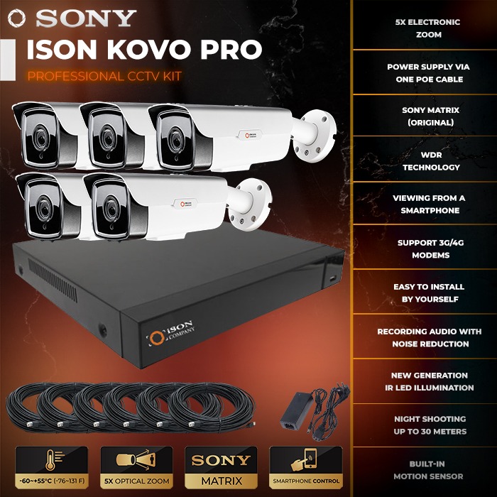 Ready-made IP video surveillance system for 5 cameras POE 4mpx ISON KOVO-5 is one of the most powerful of existing professional video surveillance systems. The system has a high resolution of 4 megapixels with variofocal motorized lenses 2.7-13.5mm (the ability to control the zoom from a smartphone, tablet or computer being anywhere in the world). IP video surveillance system for 5 cameras POE 4mpx ISON KOVO-5 is available in sets of 1,2,4,6,8,16,32 and 64 cameras. You can order IP video surveillance system for 5 cameras in our online store as with a hard disk or without. Video surveillance kit 5 cameras includes everything you need: cable, connectors, variofocal motorized cameras with motion sensors, night illumination high resolution 4 megapixels, recorder, power supply for NVR, power splitter and fasteners.