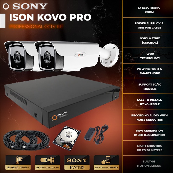 Ready-made IP video surveillance system for 2 cameras POE 4mpx ISON KOVO-2 is one of the most powerful of existing professional video surveillance systems. The system has a high resolution of 4 megapixels with variofocal motorized lenses 2.7-13.5mm (zoom control from a smartphone, tablet or computer located anywhere in the world). The system provides high definition at a distance of up to 50 meters. IP video surveillance system for 2 cameras POE 4mpx ISON KOVO-2 is available in sets of 1,2,4,6,8,16,32 and 64 cameras. You can order IP video surveillance system for 2 cameras in our online store as with a hard disk or without. Video surveillance kit 2 cameras includes everything you need: cable, connectors, varifocal motorized cameras with motion sensors, night illumination high resolution 4 megapixels, recorder, power supply for NVR, power splitter and fasteners.