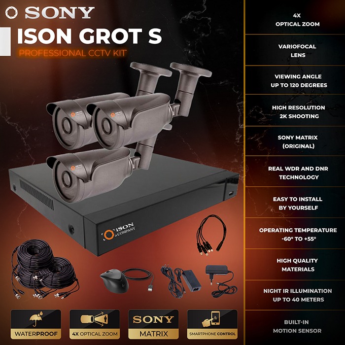The ISON GROT-S 4 megapixel video surveillance system for 3 cameras is a popular solution among professionals. The system has a high resolution of 4 megapixels 2K as well as a varifocal lens. High definition will provide a professional level of protection at sites such as private homes and cottages, business facilities, warehouses, garages, production facilities, etc. Ready-made video surveillance system for 4 megapixels ISON GROT-S for 3 cameras includes everything you need for a complete video surveillance system cameras, cable with ready-made connectors, video recorder, power supply for CCTV cameras, power supply for DVR. You can also order this system with a hard disk installed. ISON GROT-S system for 3 cameras is easy to install by yourself thanks to our step-by-step instructions.