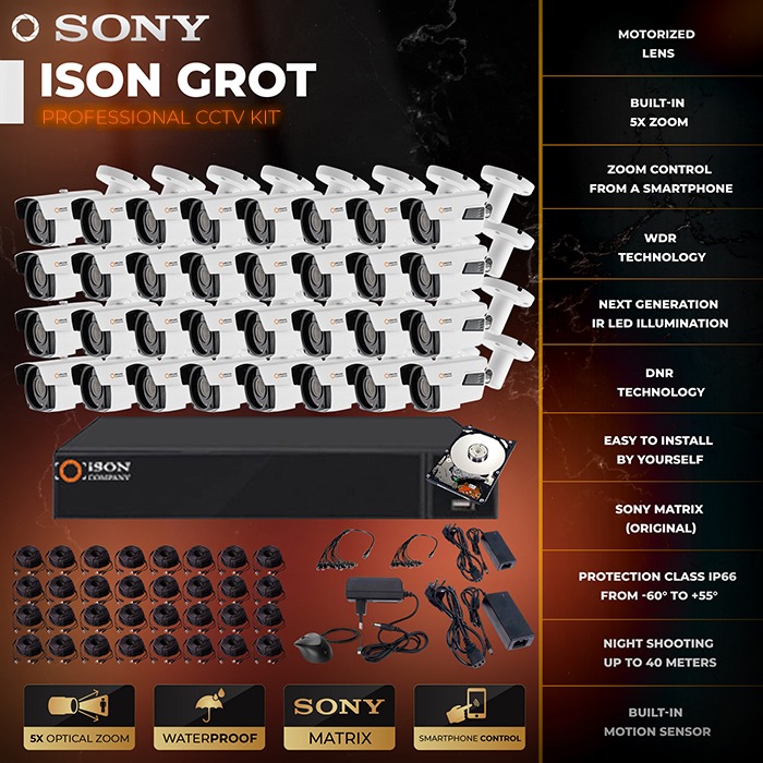 The ISON GROT 5 megapixel video surveillance system for 32 cameras is a popular solution among professionals. The system has a high resolution of 5 megapixels 2K and a motorized lens that allows you to control the zoom of the cameras remotely from a smartphone, tablet or computer anywhere in the world. High definition will provide a professional level of protection at sites such as private homes and cottages, business facilities, warehouses, garages, production facilities, etc. Ready-made video surveillance system for 5 megapixels ISON GROT for 32 cameras includes everything you need for a complete video surveillance system cameras, cable with ready-made connectors, video recorder, power supply for CCTV cameras, power supply for DVR. You can also order this system with a hard disk installed. ISON GROT system for 32 cameras is easy to install by yourself thanks to our step-by-step instructions.