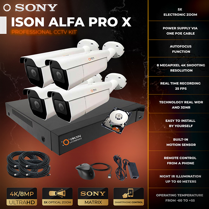Ready IP video surveillance system for 4 cameras POE 8mpx ISON ALFA PRO X-4 is one of the most powerful of existing professional video surveillance systems. The system has a high resolution of 8 megapixels with variofocal motorized lenses 2.7-13.5mm (zoom control from a smartphone, tablet or computer from anywhere in the world). IP video surveillance system for 4 cameras POE 8mpx ISON ALFA PRO X-4 is available in sets of 1,2,4,6,8,16,32 and 64 cameras.