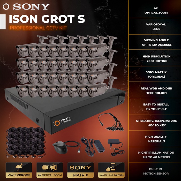 The ISON GROT-S 4 megapixel video surveillance system for 32 cameras is a popular solution among professionals. The system has a high resolution of 4 megapixels 2K as well as a varifocal lens. High definition will provide a professional level of protection at sites such as private homes and villas, business facilities, warehouses, garages, production facilities, etc. Ready-made video surveillance system for 4 megapixels ISON GROT-S for 32 cameras includes everything you need for a complete video surveillance system cameras, cable with ready-made connectors, video recorder, power supply for CCTV cameras, power supply for DVR. You can also order this system with a hard disk installed. ISON GROT-S system for 32 cameras is easy to install by yourself thanks to our step-by-step instructions.